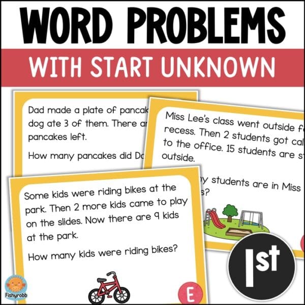 Do your first graders struggle to understand word problems? Do they know when to add or subtract? This set of task cards focuses specifically on addition and subtraction problems when the starting number is unknown. This tricky skill can be especially challenging for young learners.